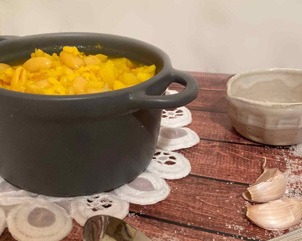 Ponemos el agua y al fuego medio, una hora y media (probamos que las habichuelas esten blandas).