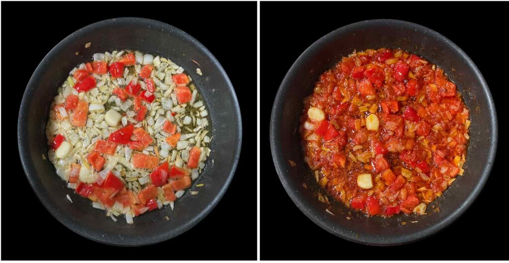 Cortamos el pimiento rojo y la cebolla a trocitos y las ponemos en una sartén con aceite, que se sofría, añadimos los ajos que se doren y el tomate a trocitos,