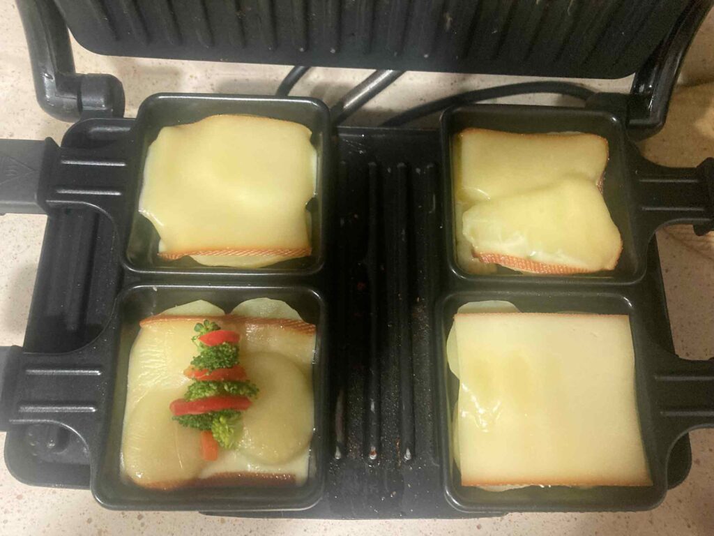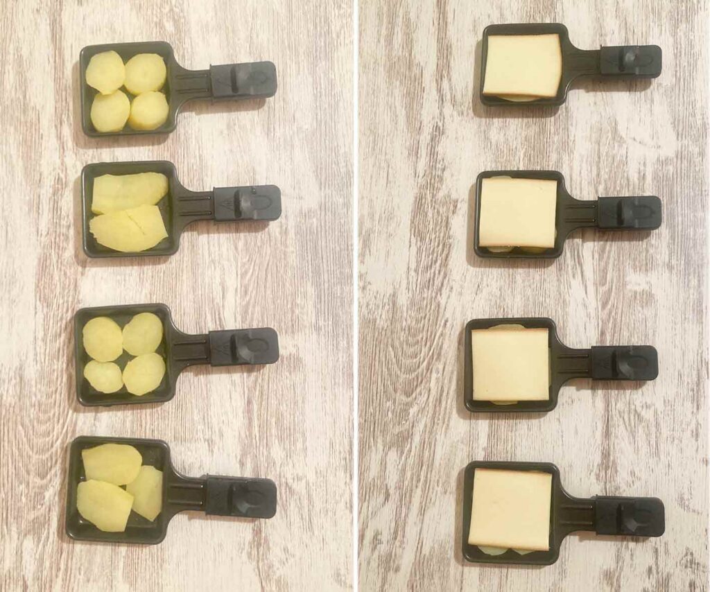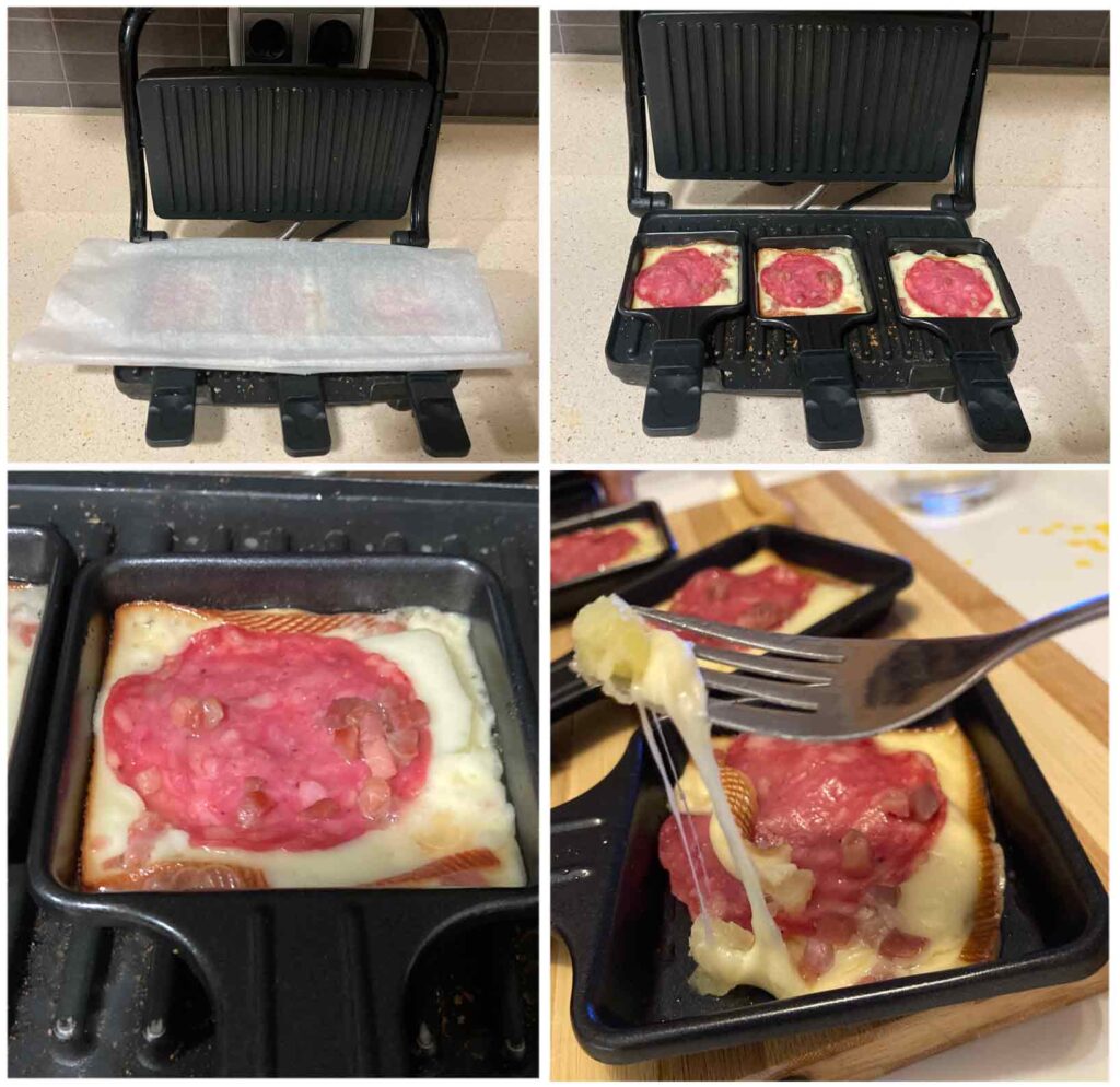 Estas mini sartenes especiales para hacer raclette son una monada, las compré en Amazon con sus paletas de madera y tienen un precio mini también…jaja, me encantan, solo tenemos que poner las patatas cocidas a trocitos, encima una loncha de queso raclette. Calentamos que el queso se funda, bien en una raclette grill (especial para hacer esta receta ) o como yo en una parrilla eléctrica donde hacemos las tostadas… que sale muy bien.