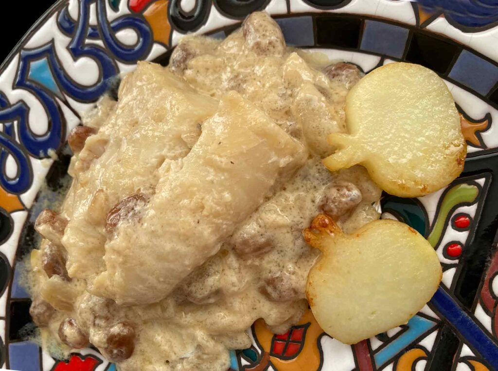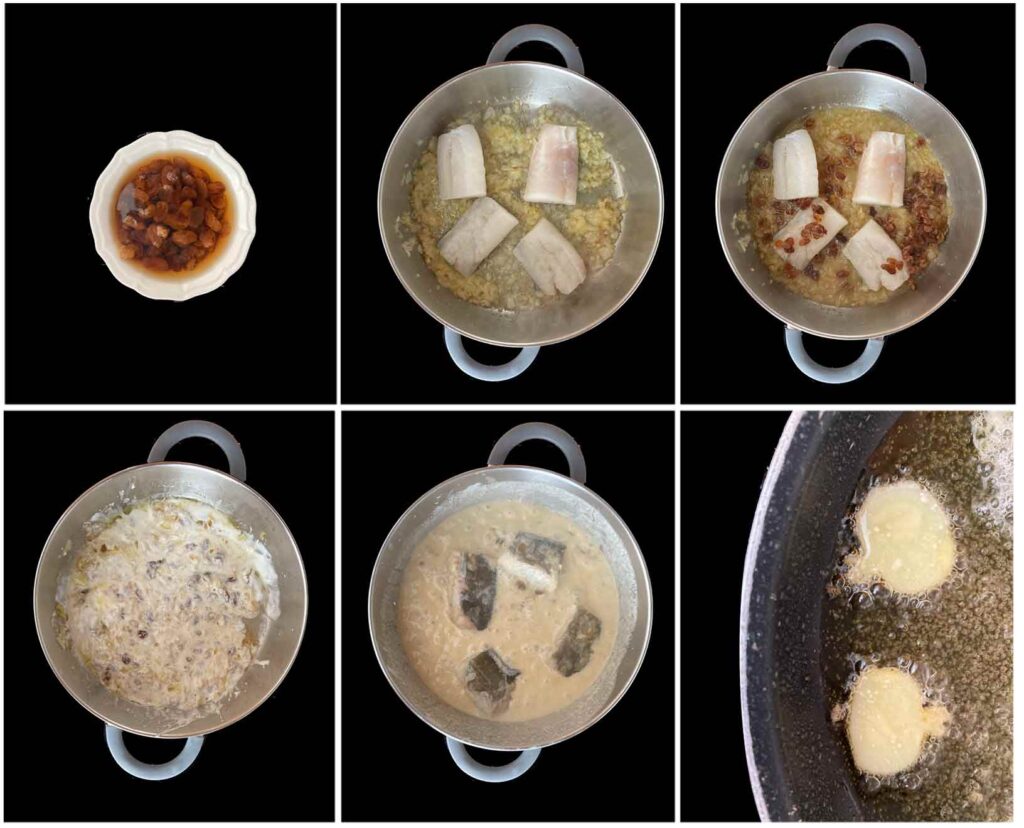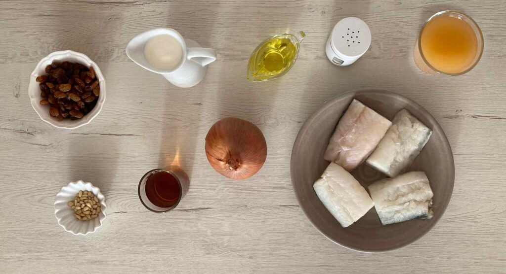 Se incorpora el sofrito al bacalao junto con las pasas, piñones y el brandy, en cuanto esté hecho, si es necesario, se aparta el bacalao hasta que tengamos la salsa.