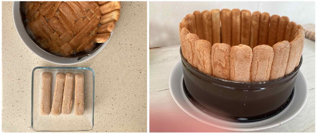 Mojamos los bizcochos que van rodeando la tarta solo por la parte lisa para que se mantengan de pie, empece a poner los del fondo para poder mantener los bizcochos que costaba un poco.