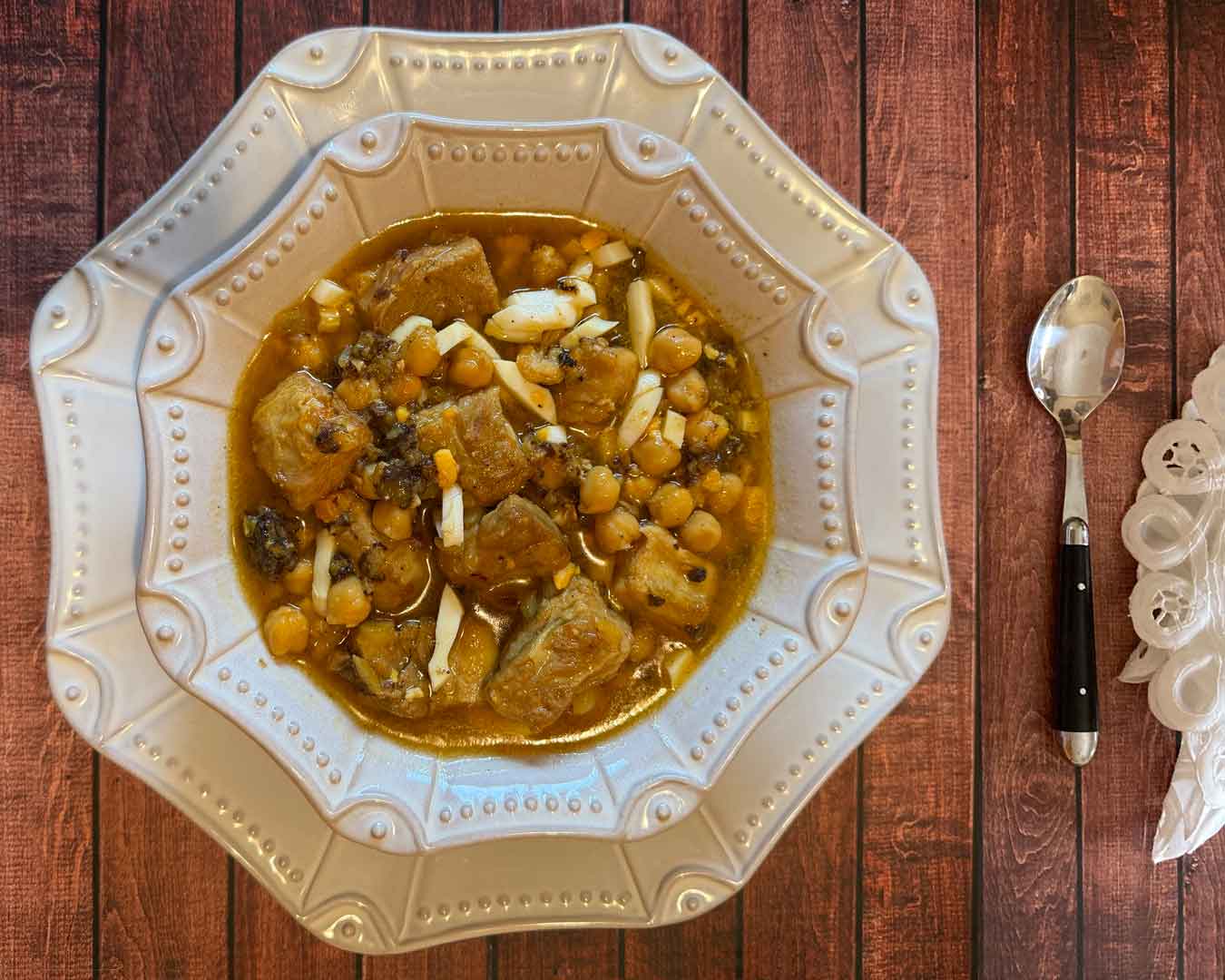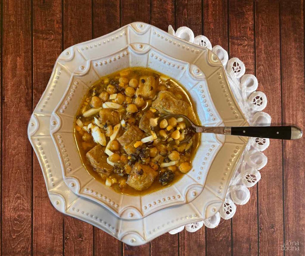 Las costillas las he cortado en trocitos más pequeños, nosotros en mi tierra no somos de morcilla de arroz, pero en esta ocasión la he utilizado, otro reto…jaja y muy rico el guiso.