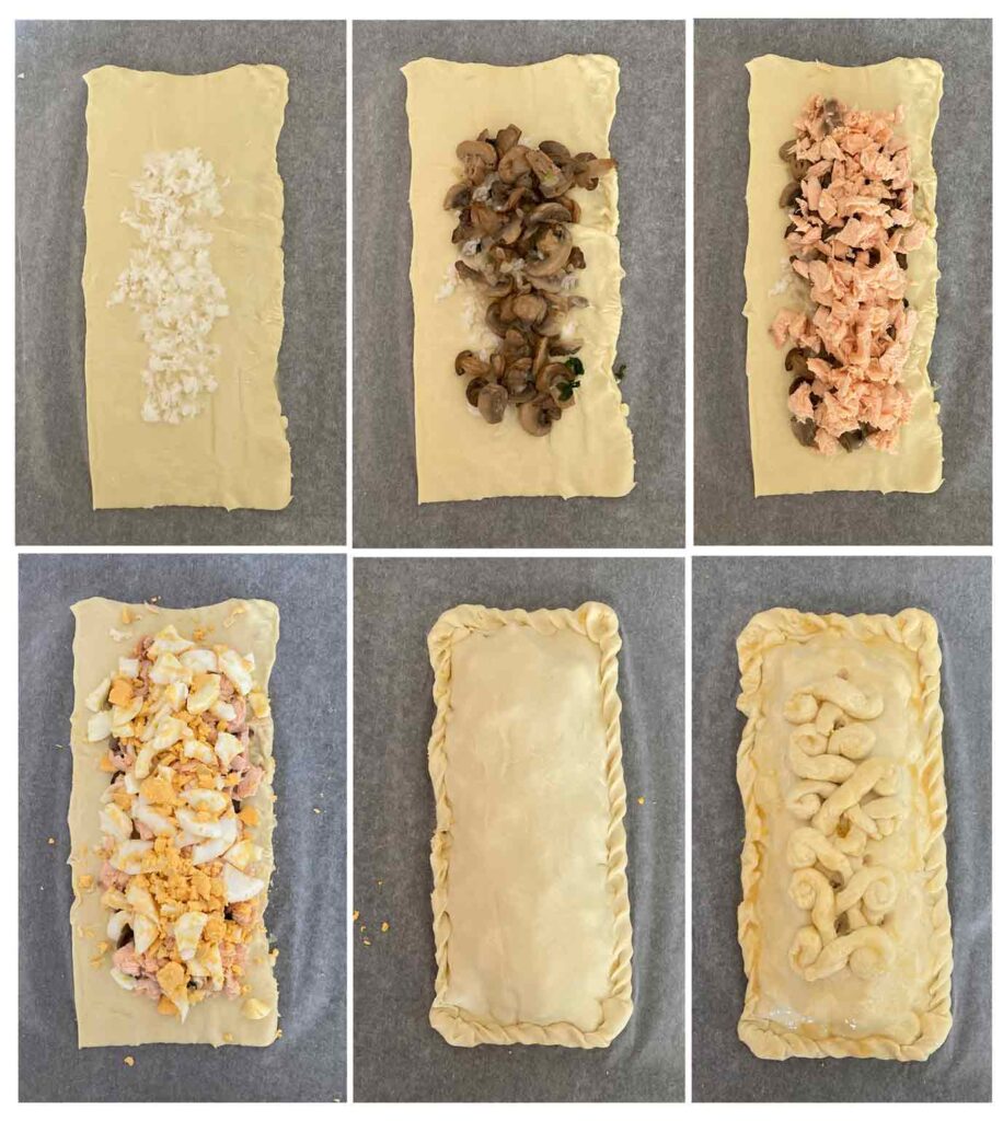 Estiramos la masa de hojaldre y la partimos por la mitad. En la bandeja del horno la forramos con papel de hornear añadimos la mitad de la masa de hojaldre y vamos montando el Kulibiak, en el centro la primera capa del relleno, la segunda el salmón, yo le añadí un poco de la charlota del caldo.