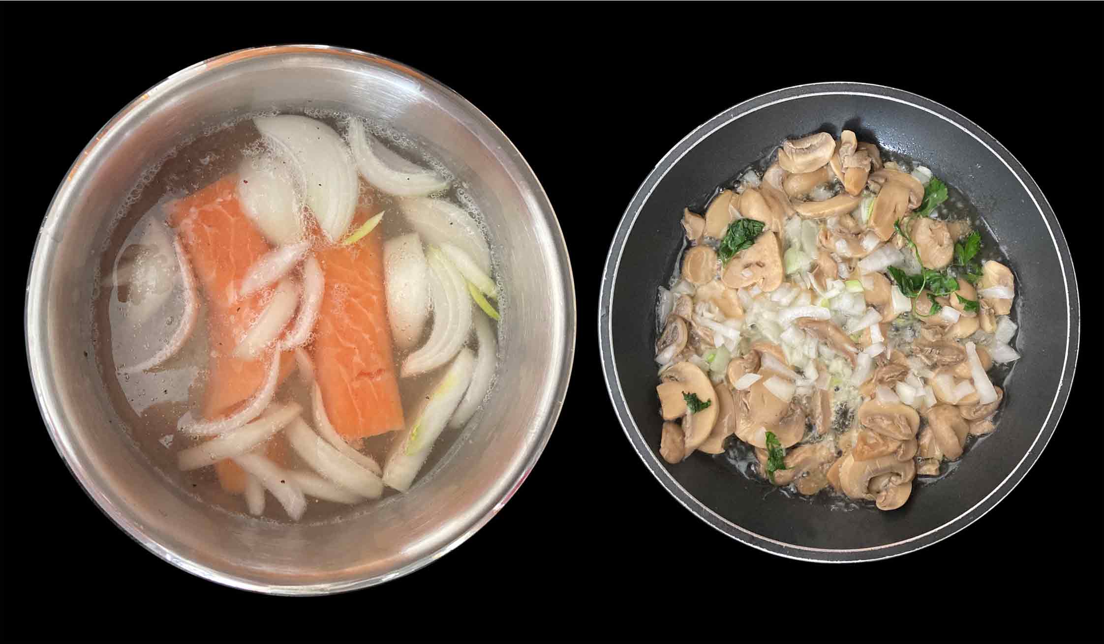 Hacemos el salmón y los champiñones con cebollita.