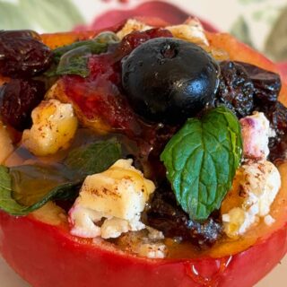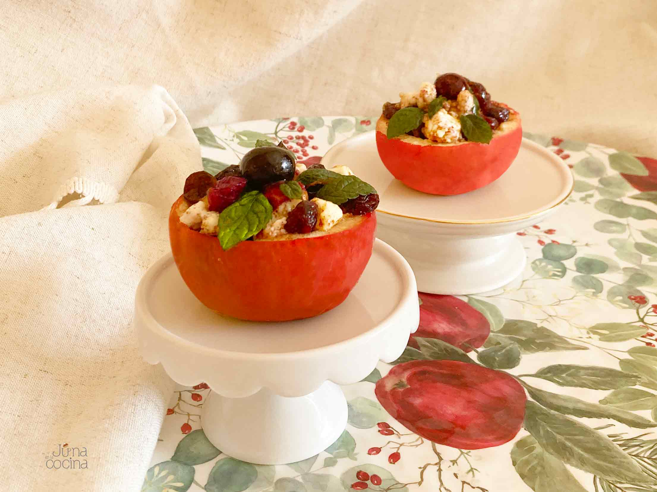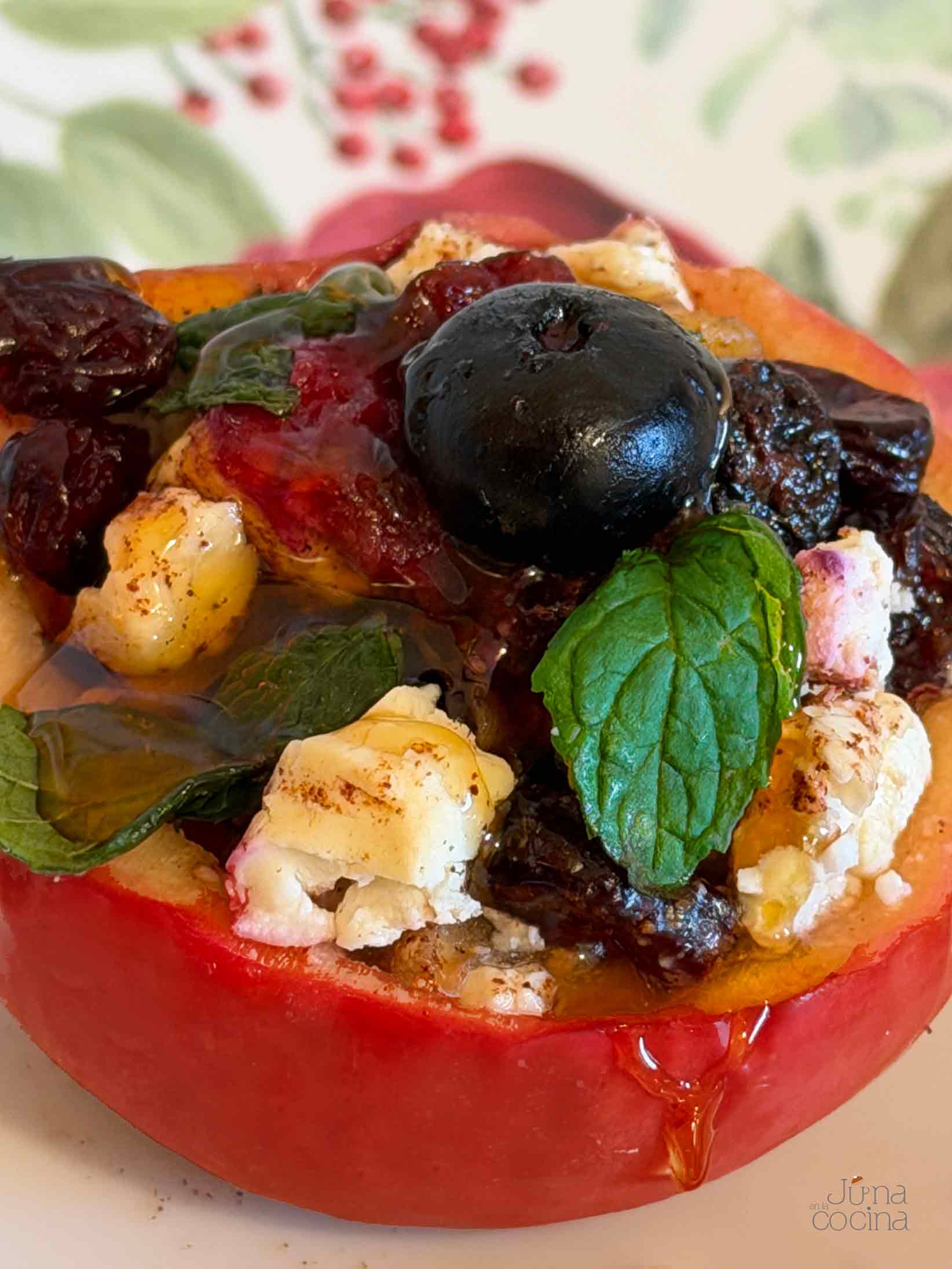 Manzana roja con queso feta, arándanos, miel, vainilla, canela y un toque de hojitas de menta, para celebrar el #ComerManzanaRojaInternationalDay el día internacional de la manzana roja…que cosas más curiosas…las manzanas rojas son muy bonitas, llaman la atención pero la belleza va por dentro, están llenas de antioxidantes, con sus pigmentos llamados antocianinas que son muy beneficios para la salud.