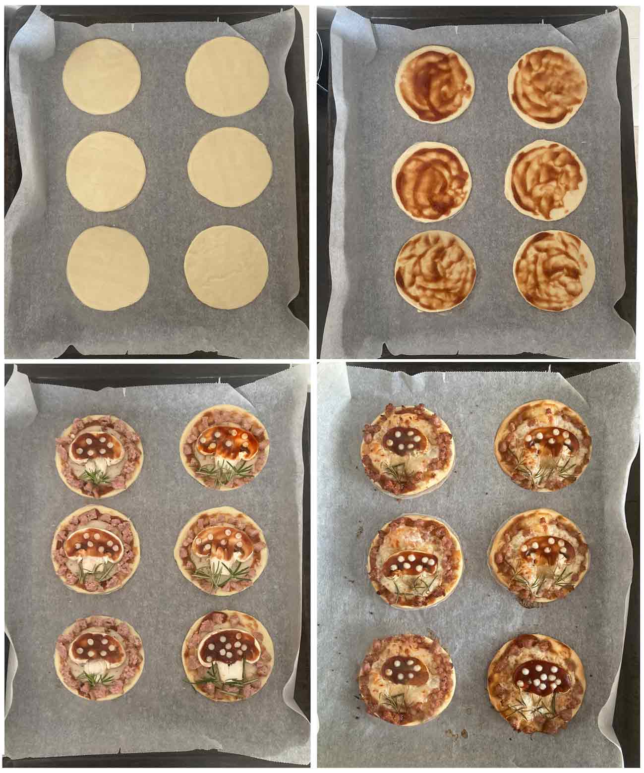 Extendemos la masa y con un cortador redondo, cortamos la base para 6 pizzas pequeñas.